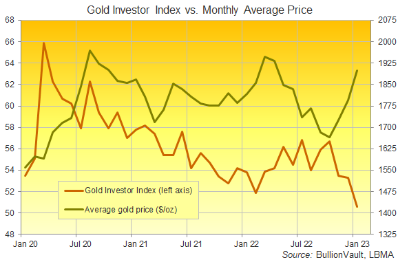 上个月选择在BullionVault出售黄金的人数比去年12月的数字猛增了81.4%,这是自2020年1月新冠危机前价格飙升以来的最大涨幅。这使得黄金卖家的数量达到了自2022年3月以来的最高值,当时俄罗斯入侵乌克兰,推动美元金价在2020年夏季的历史峰值基础上上升了1.0%。相比之下,买家数量连续第4个月下降,下滑4.7%,为2019年7月以来最少。