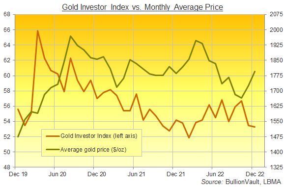 在2022年最后一个月,BullionVault的黄金投资者指数下跌至11个月以来的最低点53.3。而白银投资者更是录得47.5的历史新低点,这表明了十二月的白银卖家多于买家,自2012年有记录以来,白银投资者指数仅有六次低于50。